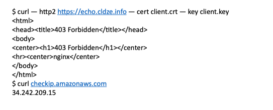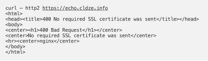 - Let’s try to curl the website without client certificate and key certificate – we get an error message: “400 Bad Request”.