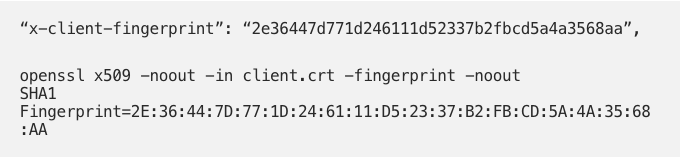 For the validation requirement, we configured the NGINX to transfer the client certificate fingerprint to the backend app.