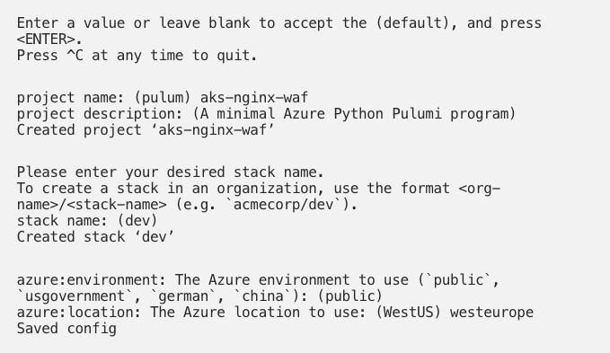 - The command will launch a short configuration section for a new Pulumi project.