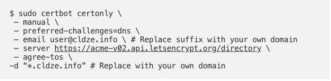 The result of this command is two pem files privkey.pem and fullchain.pem.