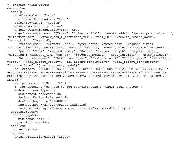 - Now for the Ingress-NGINX deployment. I use Helm 3 to deploy Ingress-NGINX into the cluster, with the following value file: